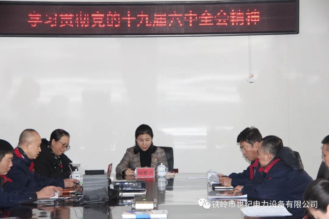 12月11日下午,鐵嶺市世紀電力設備有限公司黨支部在二樓會議室召開專題會議,傳達學習貫徹黨的十九屆六中全會精神,公司黨支部書記、總經理劉慧潔主持會議并講話,公司黨支部副書記閆紅煒、部分黨員代表出席會議。